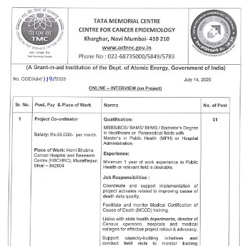 Job Code : 18 Online-Interview for the post of Project Co-ordinator, Tata Memorial Centre, Mumbai.