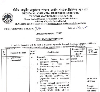 Job Code : 19 Walk-in Interview for the post of Consultant (Ayurveda), Regional Ayurveda Research Institute, Gangtok.