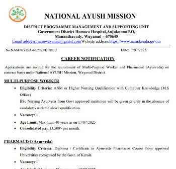 Job Code : 21 Vacancy for the posts of Multi-Purpose Worker and Pharmacist (Ayurveda), National AYUSH Mission, Wayanad.