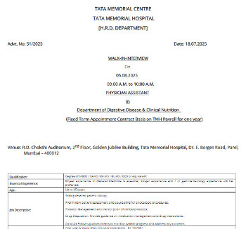 Job Code : 22 Walk-in Interview for the post of Physician Assistant, Tata Memorial Centre, Mumbai.