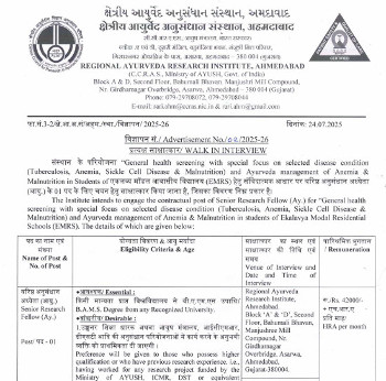 Job Code : 25 Walk-in Interview for the post of Senior Research Fellow (Ay.), Regional Ayurveda Research Institute, Ahmedabad.