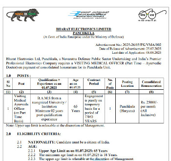 Job Code : 28 Vacancy for the post of Ayurvedic Doctor, Bharat Electronics Ltd, Panchkula.