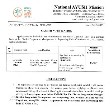 Job Code : 30 Vacancy for the post of Ayurveda Therapist, National AYUSH Mission, Kottayam.