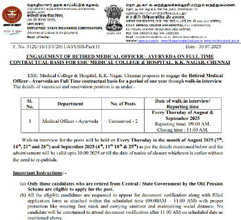 Job Code : 32 Walk-in Interview for the post of Medical Officer - Ayurveda, ESIC Medical College & Hospital, Chennai.
