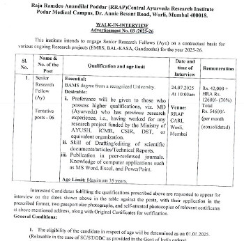 Job Code : 3 Walk-in Interview for the post of Senior Research Fellow (Ay.), Raja Ramdeo Anandilal Podar-Central Ayurveda Research Institute, Mumbai.