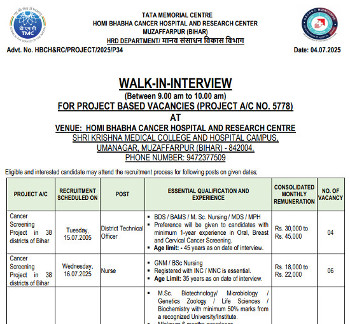 Job Code : 7 Walk-in Interview for the post of District Technical Officer, TMC-Homi Bhabha Cancer Hospital and Research Centre, Bihar.