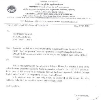 Job Code : 9 Walk-in Interview for the post of Senior Research Fellow (Ay.), CCRAS-Yashwant Ayurvedic Medical College, Kodoli.