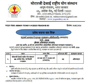 Admission Notice for Foundation Course in Yoga Science for Wellness (Offline-Weekend Course), Morarji Desai National Institute of Yoga, New Delhi.