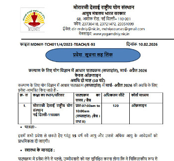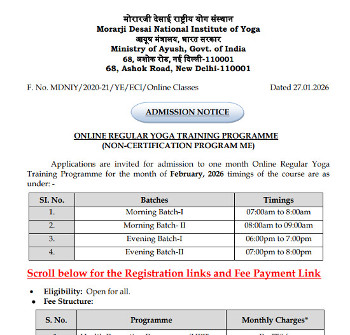 Admission Notice for Online Regular Yoga Training Programme, Morarji Desai National Institute of Yoga, New Delhi.