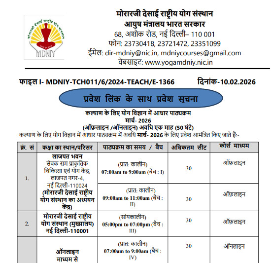 Admission Notice for Foundation Course in Yoga Science for Wellness (Online/Offline), Morarji Desai National Institute of Yoga, New Delhi.