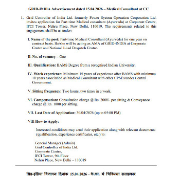 Vacancy for the post of Medical Consultant (Ayurveda), Grid Controller of India Ltd, New Delhi.