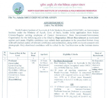 Vacancy for Various Ayurveda posts, North Eastern Institute of Ayurveda and Folk Medicine Research, Pasighat.