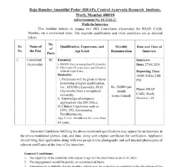 Walk-in Interview for the post of Consultant (Ayurveda), Central Ayurveda Research Institute, Mumbai.
