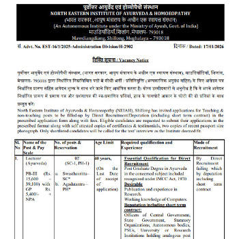 Vacancy for the post of Lecturer (Homeopathy), North Eastern Institute of Ayurveda & Homoeopathy, Meghalaya.