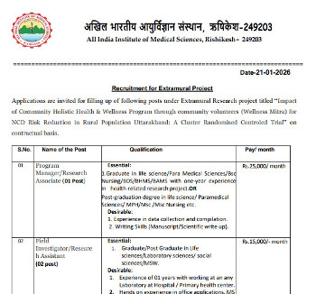 Vacancy for the post of Program Manager/Research Associate (Homeopathy), All India Institute of Medical Sciences, Rishikesh.
