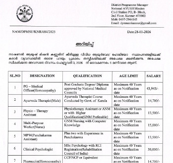 Vacancy for the posts of Medical Officer & Pharmacist (Homeo), National AYUSH Mission, Kannur.
