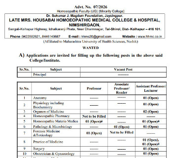 Vacancy for the posts of Homeopathic Faculty, Late Mrs. Housabai Homoeopathic Medical College & Hospital, Nimshirgaon.