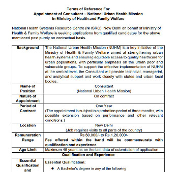 Vacancy for the post of Consultant - NUHM (Unani), National Health Systems Resource Centre, New Delhi.