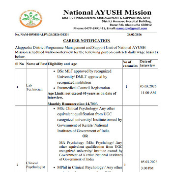 Vacancy for the post of Yoga Instructor, National AYUSH Mission, Alappuzha.