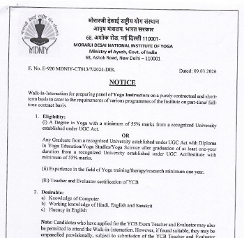 Vacancy for the post of Yoga Instructor, Morarji Desai National Institute of Yoga, New Delhi.
