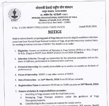 Vacancy for the post of Yoga Interns, Morarji Desai National Institute of Yoga, New Delhi.