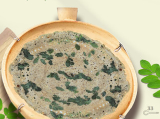 Mix enough salt and spread the batter on a hot pan and sprinkle drumstick leaves over it.