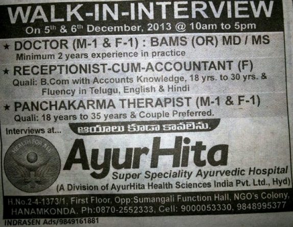 Walk-in-Interview for the Posts of BAMS Doctor and Panchakarma Therapist, AyurHita ,Hanamakonda.