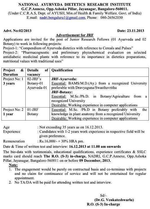 Vacancy for the Posts of Junior Research Fellows(JRF), National Ayurveda Dietetics Research Institute, Bangalore.
