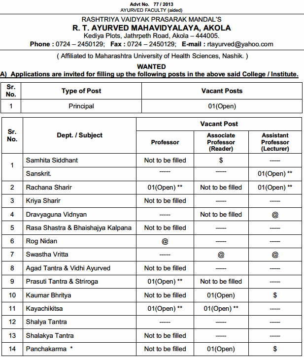 Vacancies for the Posts of Principal,Professor,Associate Professor(Reader) and Assistant Professor(Lecturer) R.T Ayurved Mahavidyalaya, Jatherpeth, Akola.
