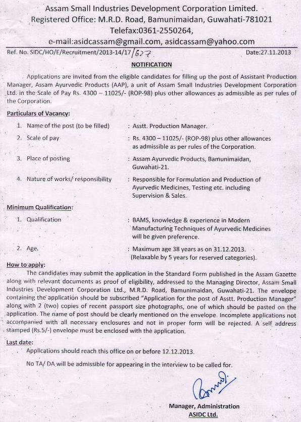 Vacancy for the Posts of Assistant Production Manager, Assam Small Industries Development Corporation Limited.