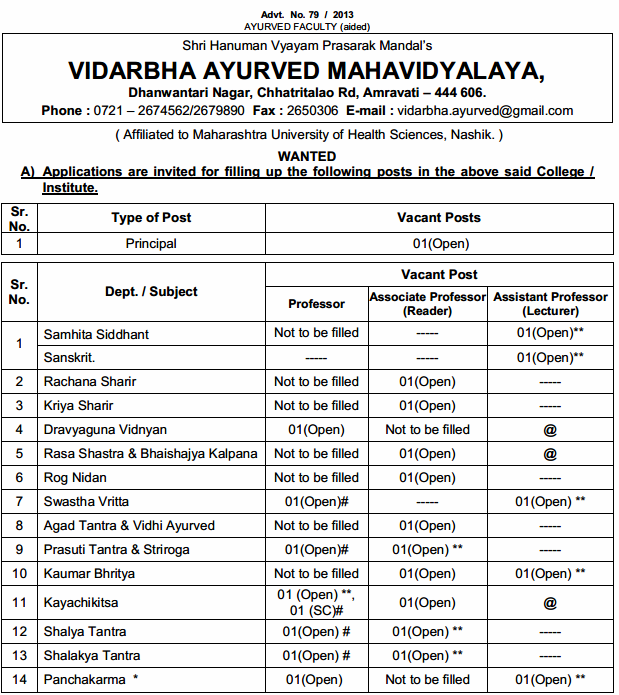 Vacancies for the Posts of Principal,Professor,Associate Professor(Reader) and Assistant Professor(Lecturer), Vidarbha Ayurved Mahavidyalaya, Amravati.