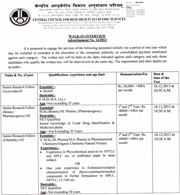 Walk-in-interview for the post of SRF(Ayurveda, Botany, Chemistry), Central Council for Research in Ayurvedic Sciences (CCRAS).