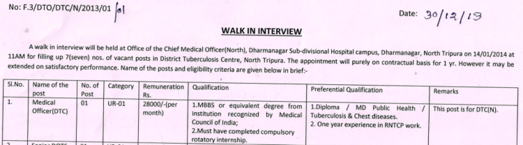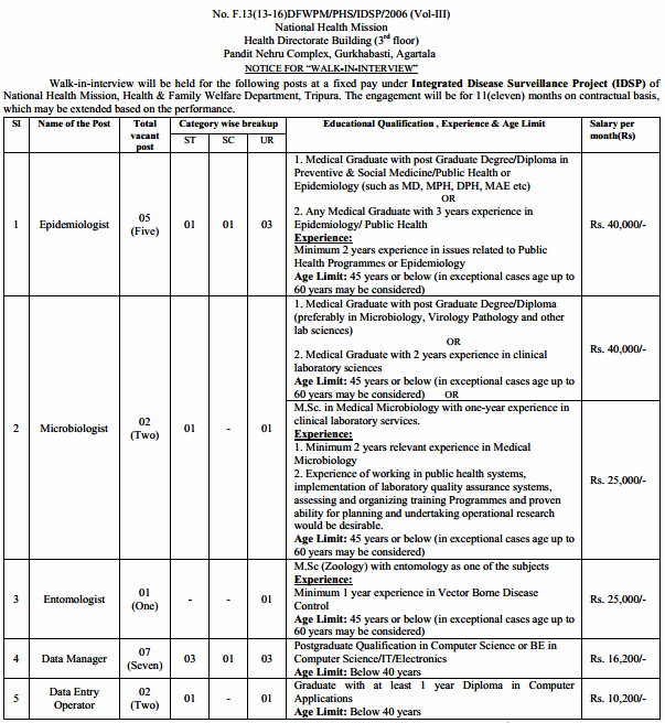 Walk-in-interview for the post of Epidemiologist and Microbiologist , National Health Mission, Health & Family Welfare Department, Tripura.