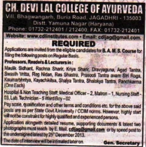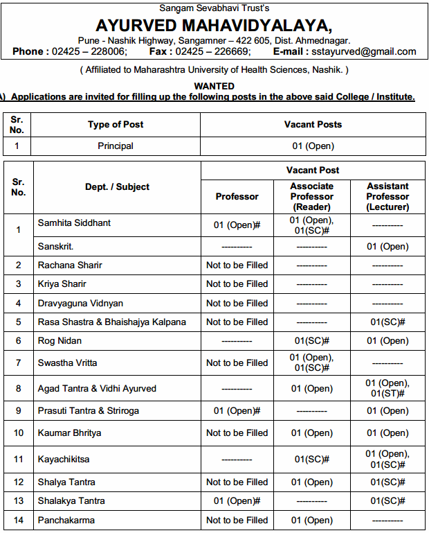 Vacancies for the post of Principal,Professor,Associate Professor(Reader) and Assistant Professor (Lecturer), Sangam Sevabhavi Trust's Ayurved Mahavidyalaya,Sangamner,Dist. Ahmednagar.
