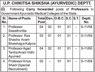 Vacancy for the post of Professors in Government Ayurvedic Medical Colleges, U.P. Chikitsa shiksha (Ayurvedic) Department, Uttar Pradesh Public Service Commission(UPPSC).