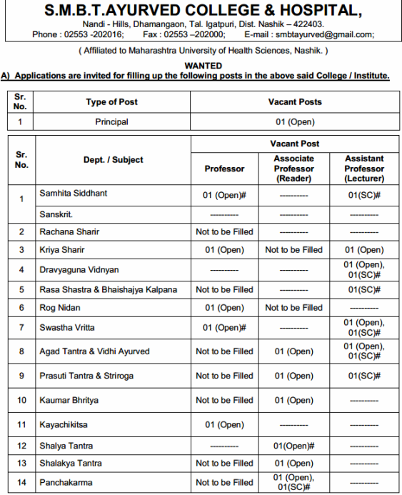 Vacancies for the post of Principal,Professor,Associate Professor(Reader) and Assistant Professor (Lecturer), SMBT Ayurved College & Hospital,Dhamangaon.