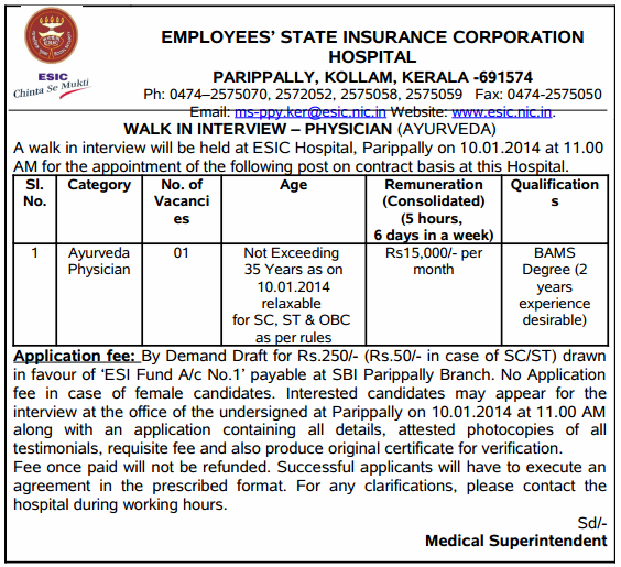 Walk-in-Interview for the post of Ayurveda Physician, Employees' State Insurance Corporation Hospital,Parippally,Kollam, Kerala.