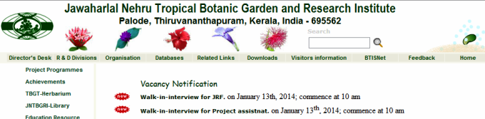 Walk-in-Interview for the post of JRF(Junior Research Fellow) and Project Assistnat, Jawaharlal Nehru Tropical Botanic Garden and Research Institute, Kerala.