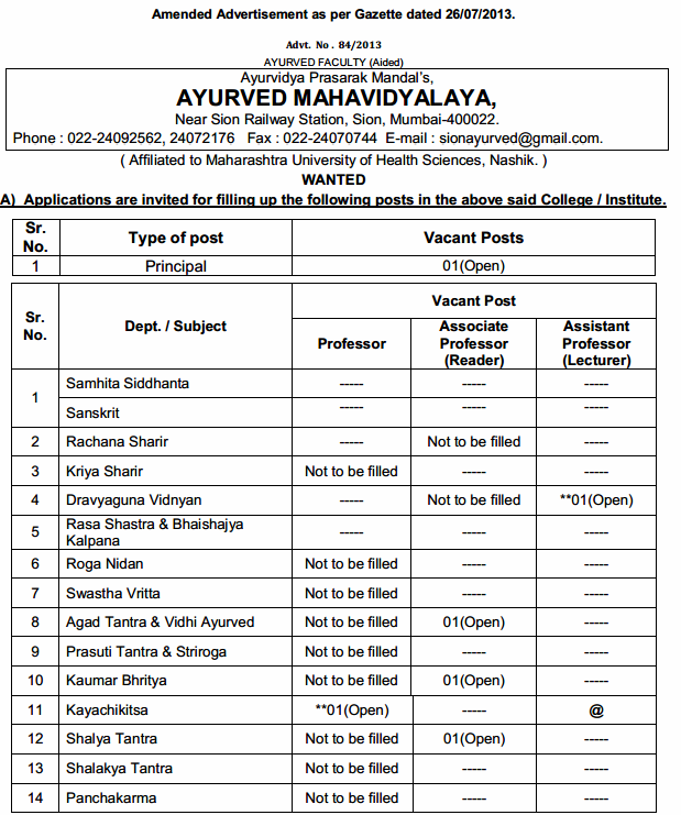 Vacancies for the post of Principal,Professor,Associate Professor(Reader) and Assistant Professor (Lecturer), Ayurvidya Prasarak Mandal's Ayurved Mahavidyalaya,Sion, Mumbai.