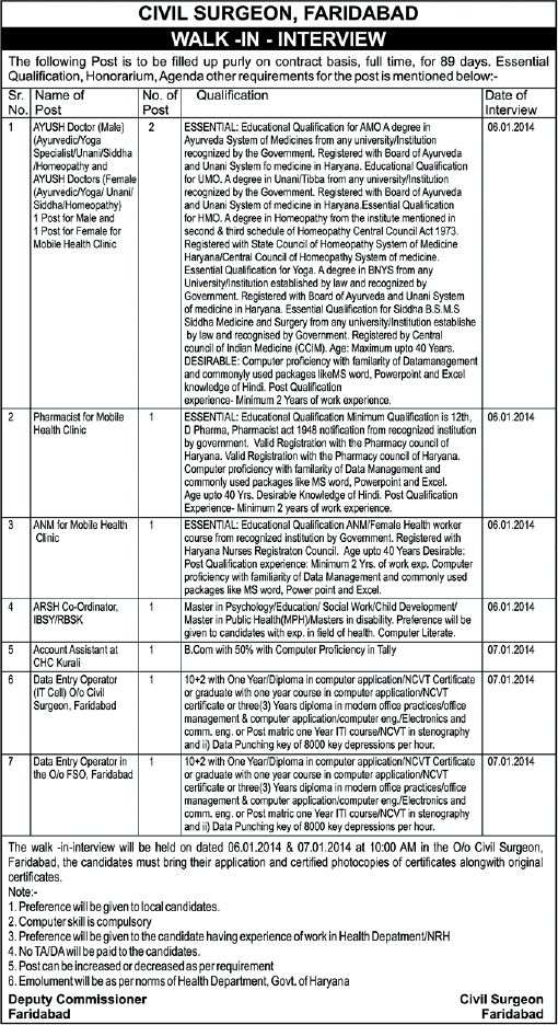 Walk-in-Interview for the post of AYUSH Doctors, Civil Surgeon Office, Faridabad, Haryana.