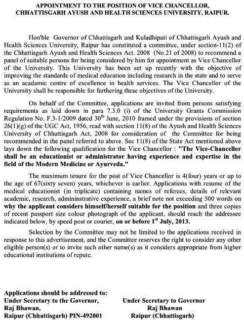 Appointment To The Position Of Vice Chancellor, Chhattisgarh Ayush And Health Sciences University,Raipur.