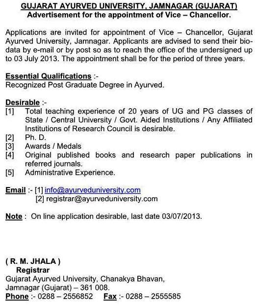 Vacancy for the Posts of Vice-Chancellor, Gujarat Ayurved University, Jamnagar,Gujarat.