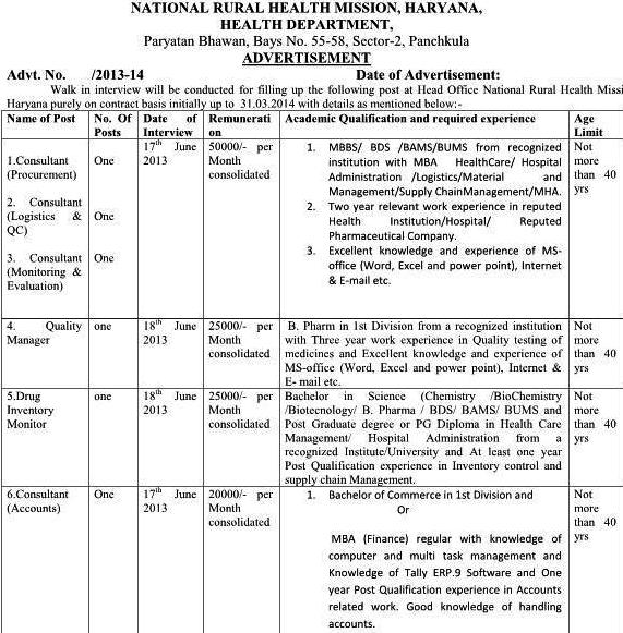 Walk-in-Interview for the Posts of Consultant and Drug Inventory Monitor, National Rural Health Mission,Haryana.