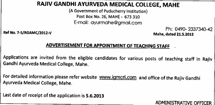 Vacancies for the Post of Associate Professor,Professor and Lecturers Rajiv Gandhi Ayurveda Medical college, Mahe.