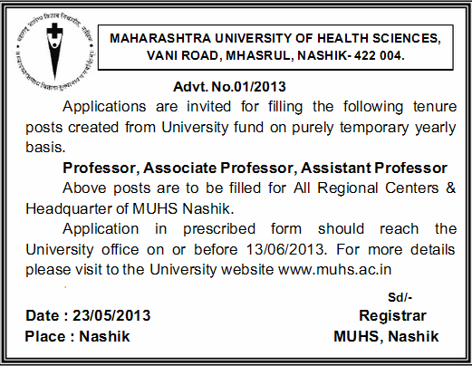 Vacancies for the Post of Professor, Associate Professor, Assistant Professor Maharashtra University Of Health Sciences, Nashik.