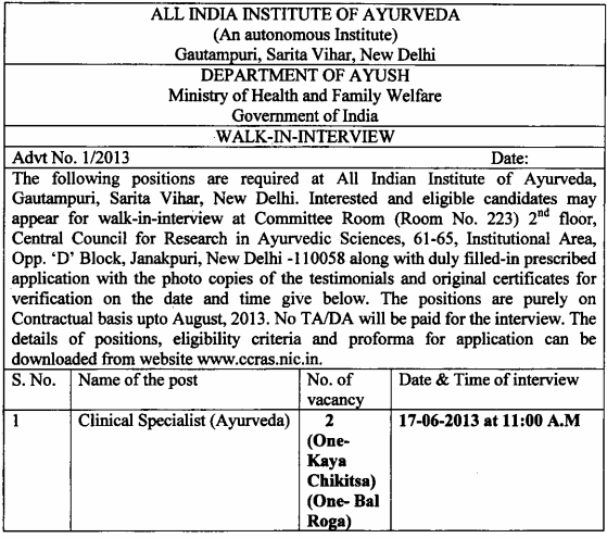 Walk-in-Interview for the Post of Clinical Specialist at , ALL INDIA INSTITUTE OF AYURVEDA (AIIA).