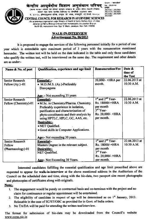 Walk-in-Interview for the Post of Senior Research Fellow(Ayurveda), CCRAS,New Delhi.