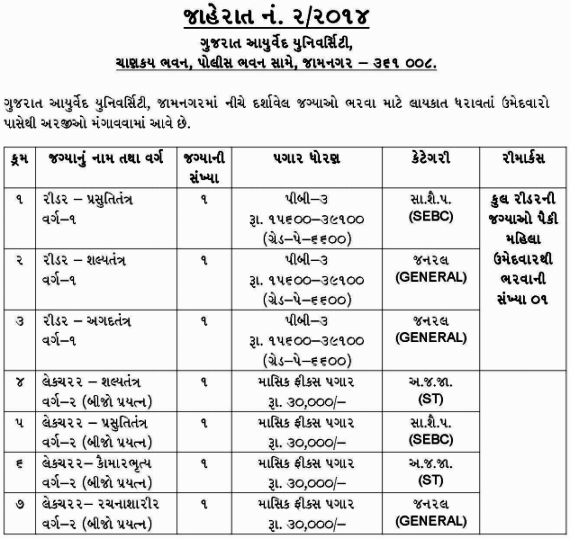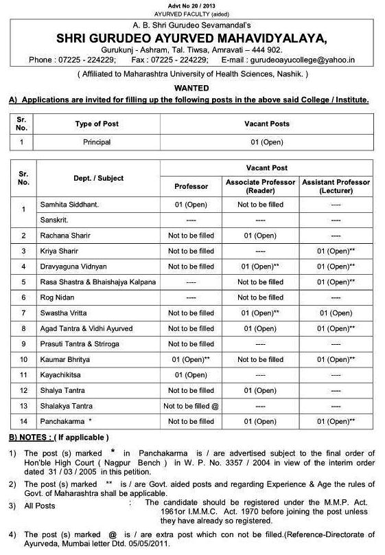 Vacancy for the post of Principal,Professor,Asso.Professor/Reader,Lecturer For A. B. Shri Gurudeo Sevamandal Shri Gurudeo Ayurved Mahavidyalaya, Gurukunj-Ashram, Tal. Tiwsa, Amravati