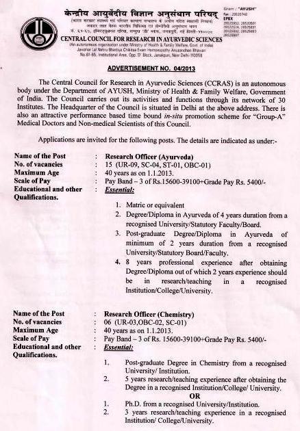 Applications are invited for the posts of Research Oficer (Ayurveda)