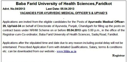 Vacancies For Ayurvedic Medical Officer's and Upvaid's Baba Farid University of Health Sciences,Faridkot,Punjab